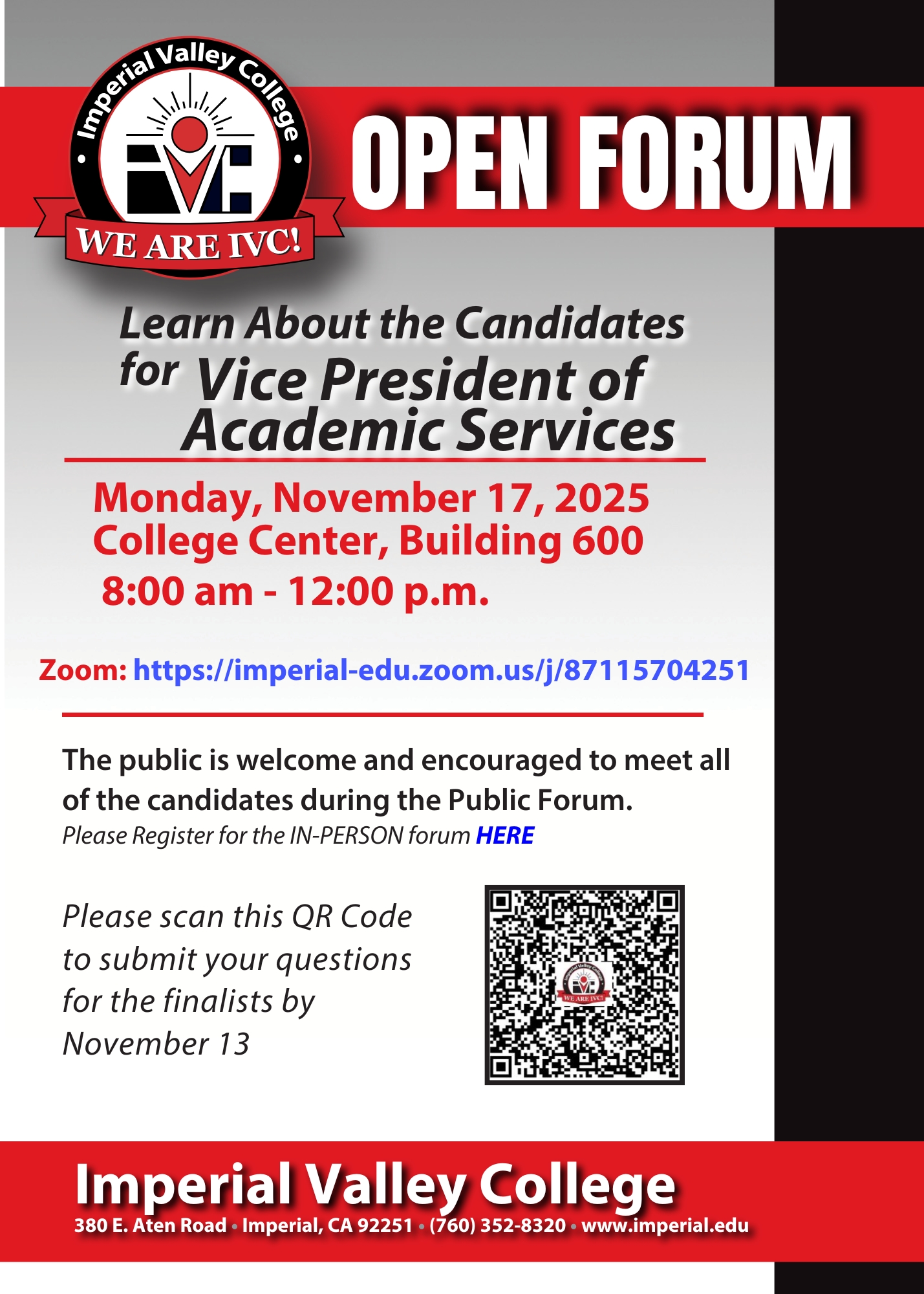 Join us on Monday, November 17, from 8:00 a.m. to 12:00 p.m. in the College Center or via Zoom to meet the four finalists for Imperial Valley College’s next Vice President of Academic Services.