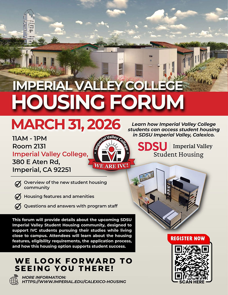 Students interested in learning more are invited to attend the IVC Housing Forum on March 31 from 11 a.m. to 1 p.m. in Room 2131, where details on housing features, eligibility, and the application process will be shared. Families are also welcome to attend and explore this exciting opportunity together.