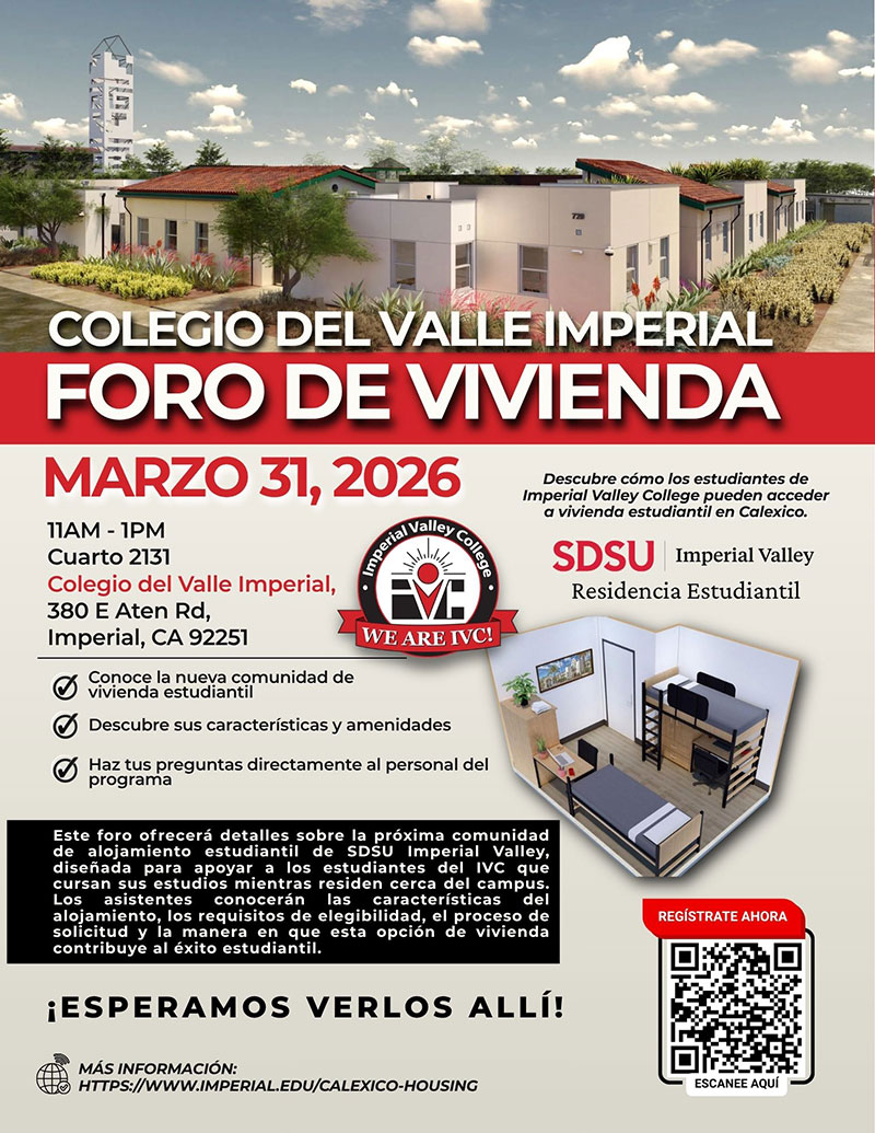 Imperial Valley College students will soon have access to brand-new, affordable housing located on the SDSU Imperial Valley campus in Calexico, just a short 5-minute walk from two Calexico-to-IVC Express bus stops. Developed in partnership with SDSU Imperial Valley and The Scion Group, this new student housing community offers a convenient, connected, and supportive living environment for IVC and SDSU students alike.