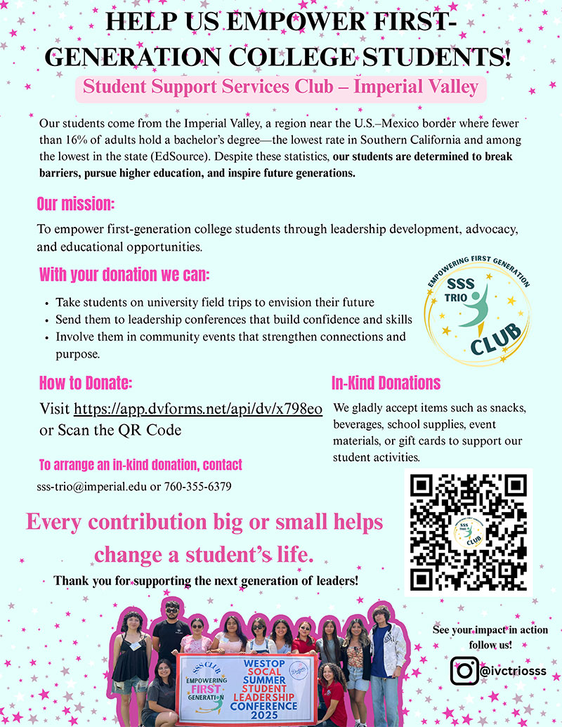 The SSS Club is dedicated to empowering first-generation students by fostering a supportive community that encourages social, recreational, and educational engagement. Our mission is to inspire confidence, integrity, and pride in each member, helping them navigate their academic journey with purpose and determination.